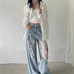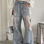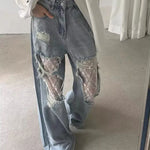 Loose fit denim trousers featuring distressed detailing and lace splicing for a modern Y2K aesthetic. Designed with a high waist and relaxed silhouette, these jeans combine edgy streetwear with feminine accents. Perfect for casual outings or statement styling. Available in light blue wash.