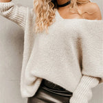 An effortlessly relaxed V-neck sweater featuring a draped batwing silhouette and soft textured knit. Designed for comfort and modern ease, this oversized pullover offers a flattering shape ideal for transitional weather and layered looks.