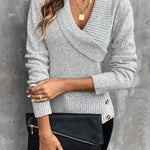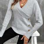 Cozy ribbed knit pullover featuring a wide folded collar and flattering wrap-style neckline. Designed for comfort and elegance, this sweater blends warmth with a feminine silhouette — perfect for cool autumn and winter days. Finished with button accents on one side for a refined touch.