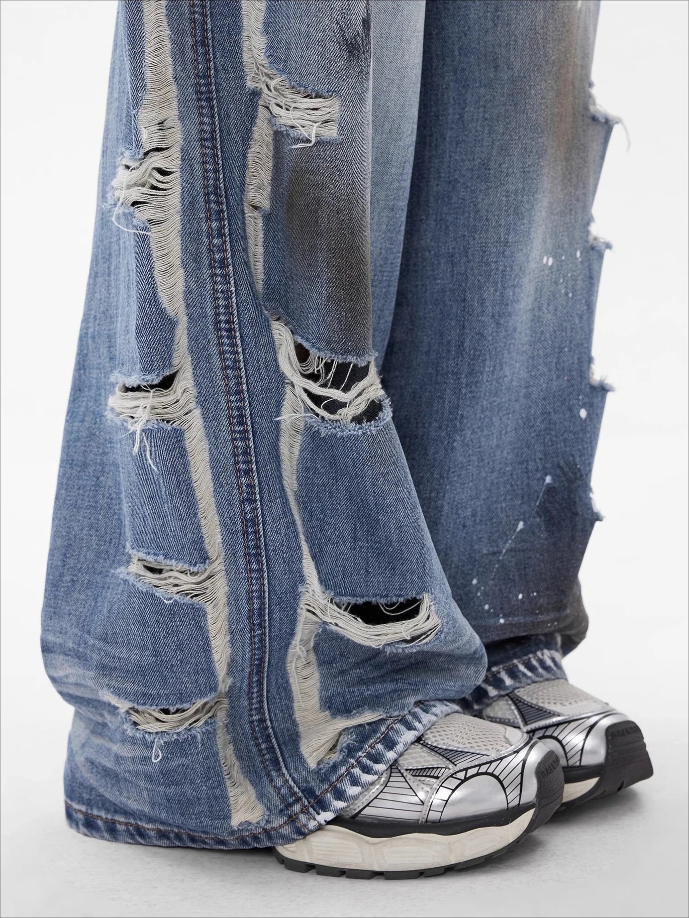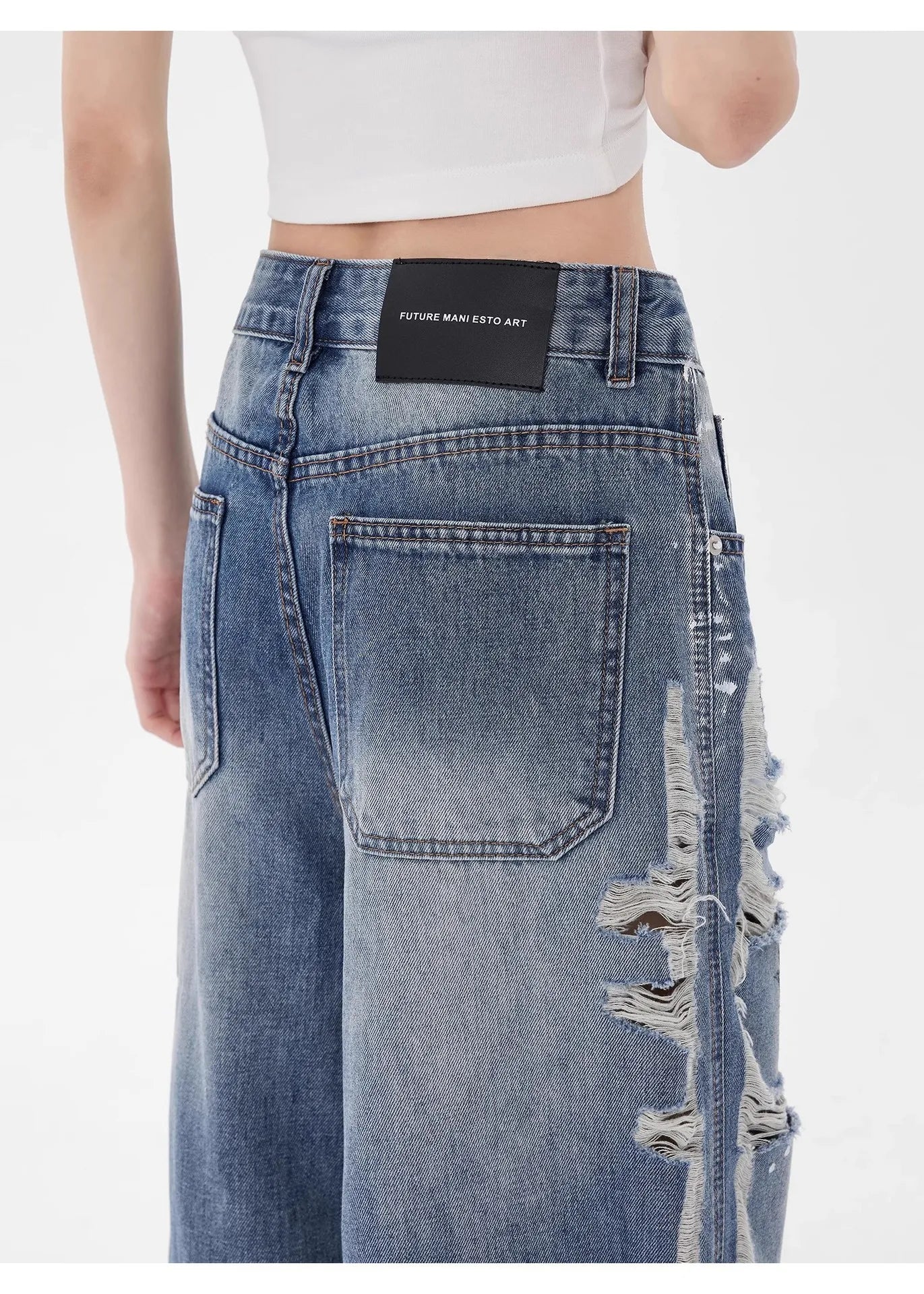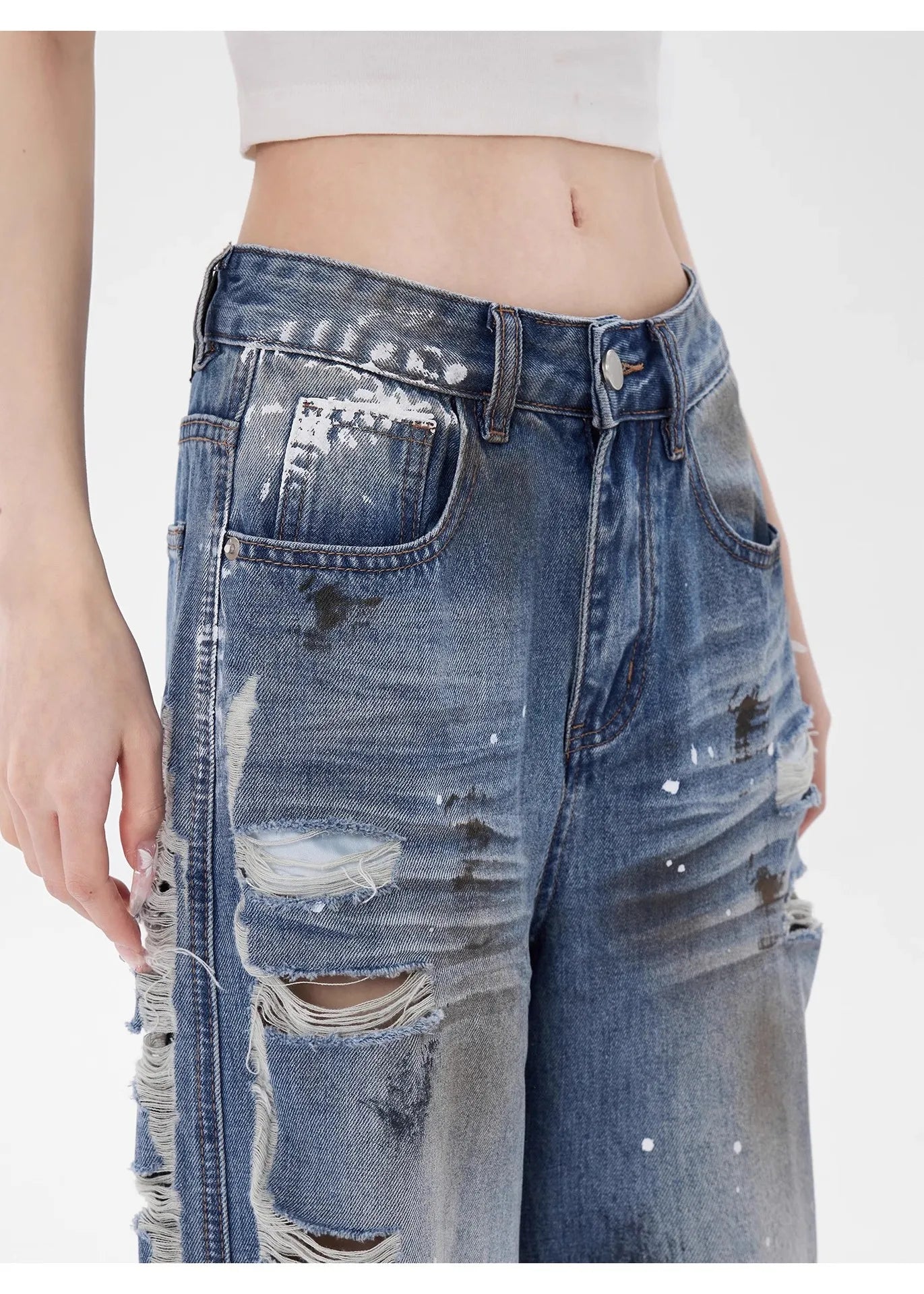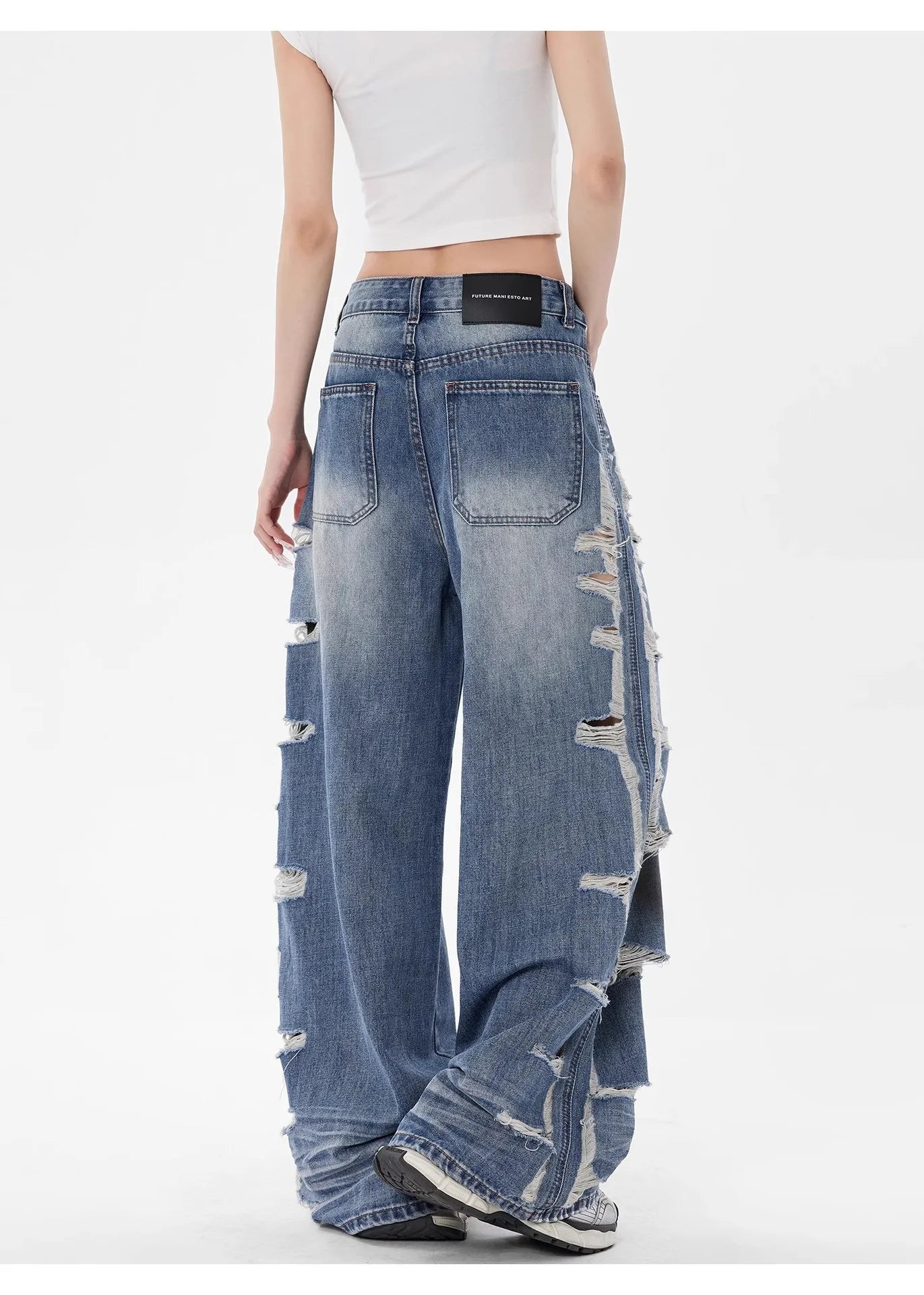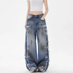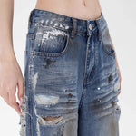 Loose fit distressed denim jeans crafted for a bold, retro inspired streetwear look. These jeans feature a high rise waist, heavily ripped details, and a raw edge hem for a rugged. The wide leg cut provides effortless movement and a relaxed silhouette, while the faded wash adds a worn in, vintage appeal. Perfect for pairing with crop tops, graphic tees, or oversized jackets for an edgy everyday outfit.