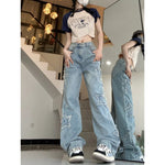 High waisted wide leg jeans featuring intricate embroidery detailing for a distinctive retro aesthetic. Crafted from durable washed denim for a structured yet comfortable feel. Designed with classic five pocket styling, a front button closure, and a flattering full length silhouette. Perfect for adding a touch of individuality to casual or streetwear looks.