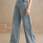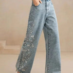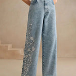 Elegant and comfortable plus size jeans designed in a high rise silhouette with intricate floral embroidery along the leg. Crafted from soft, stretch denim for ease of movement while maintaining a structured, flattering fit. The straight wide leg design elongates the figure, while the washed ice blue tone adds a refined vintage look. Perfect for pairing with blouses or knitwear for a polished, effortless style.