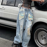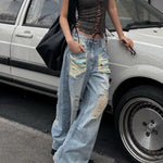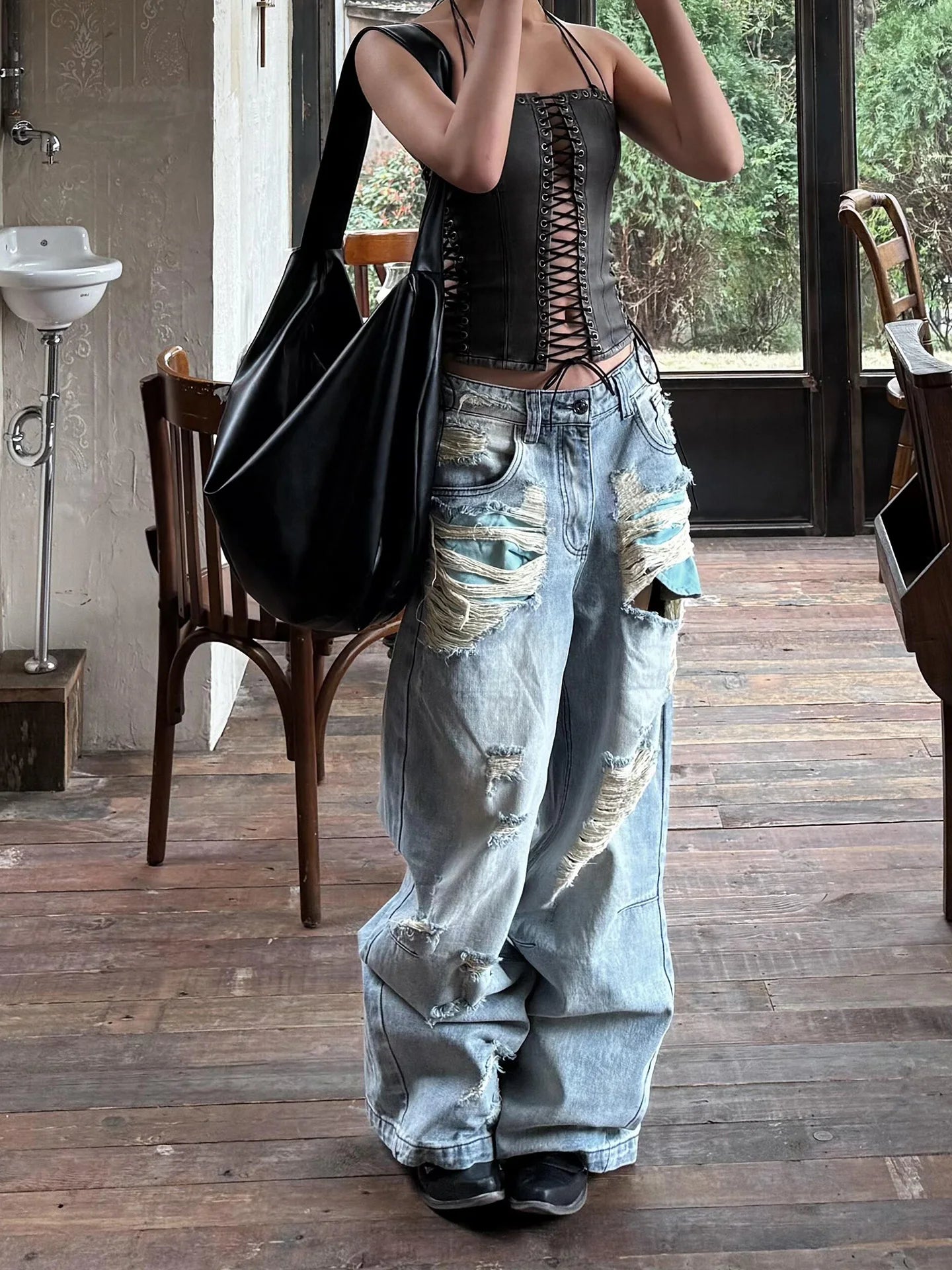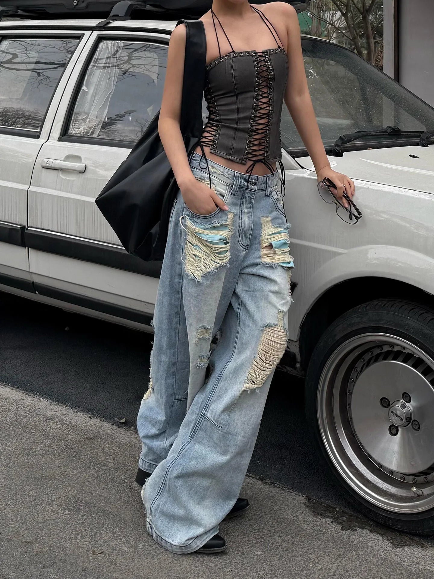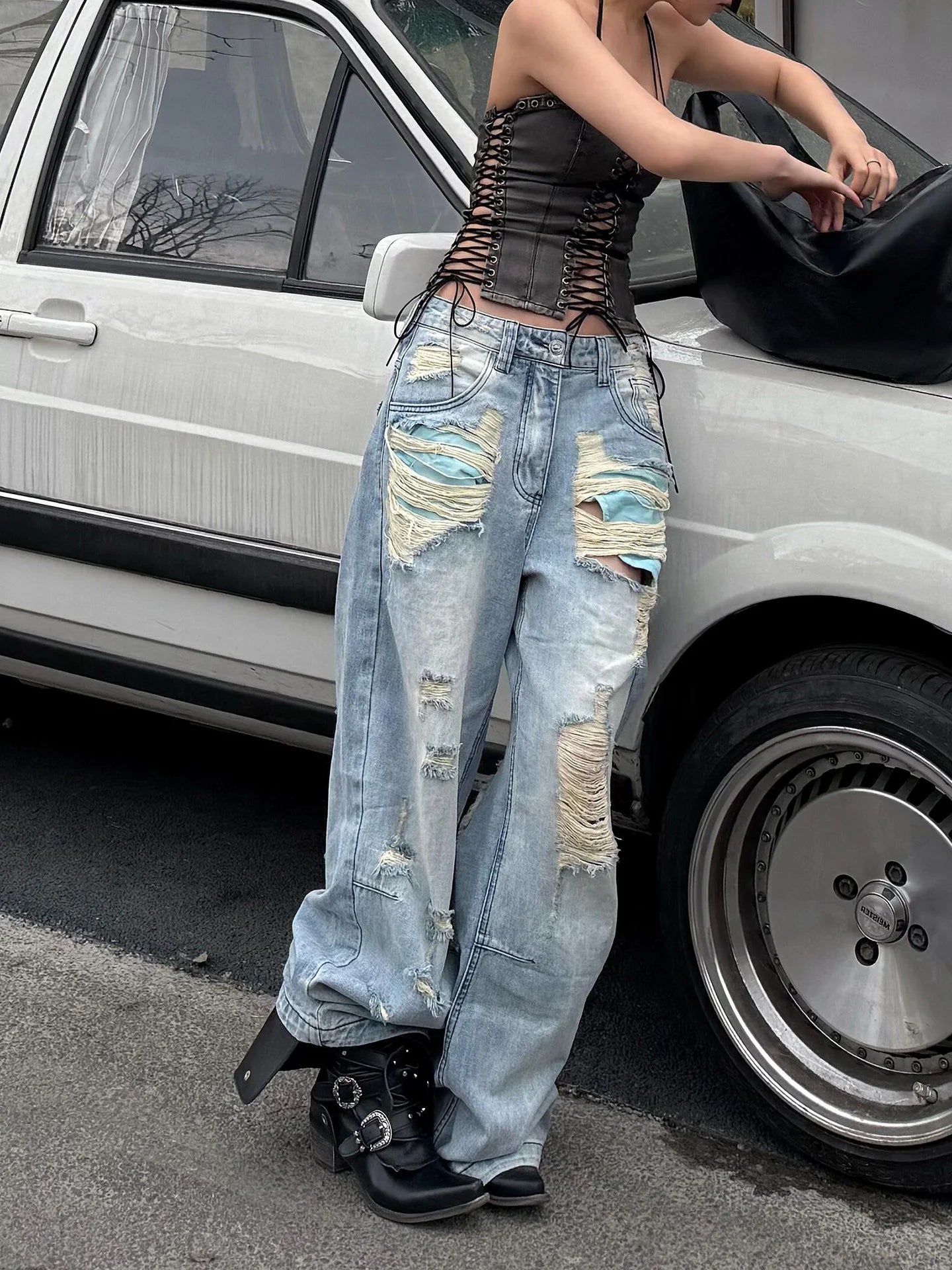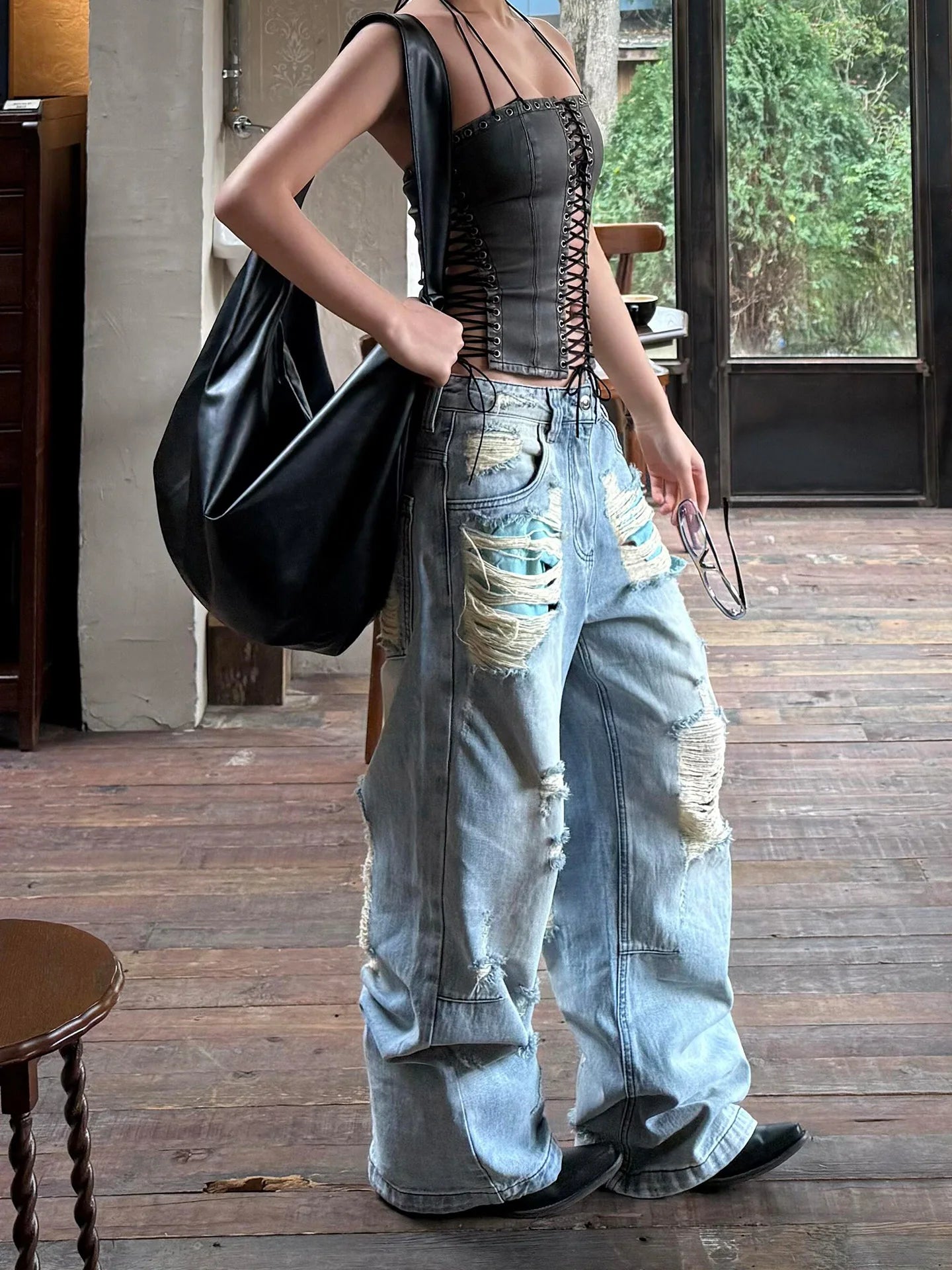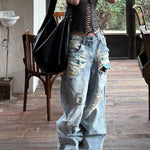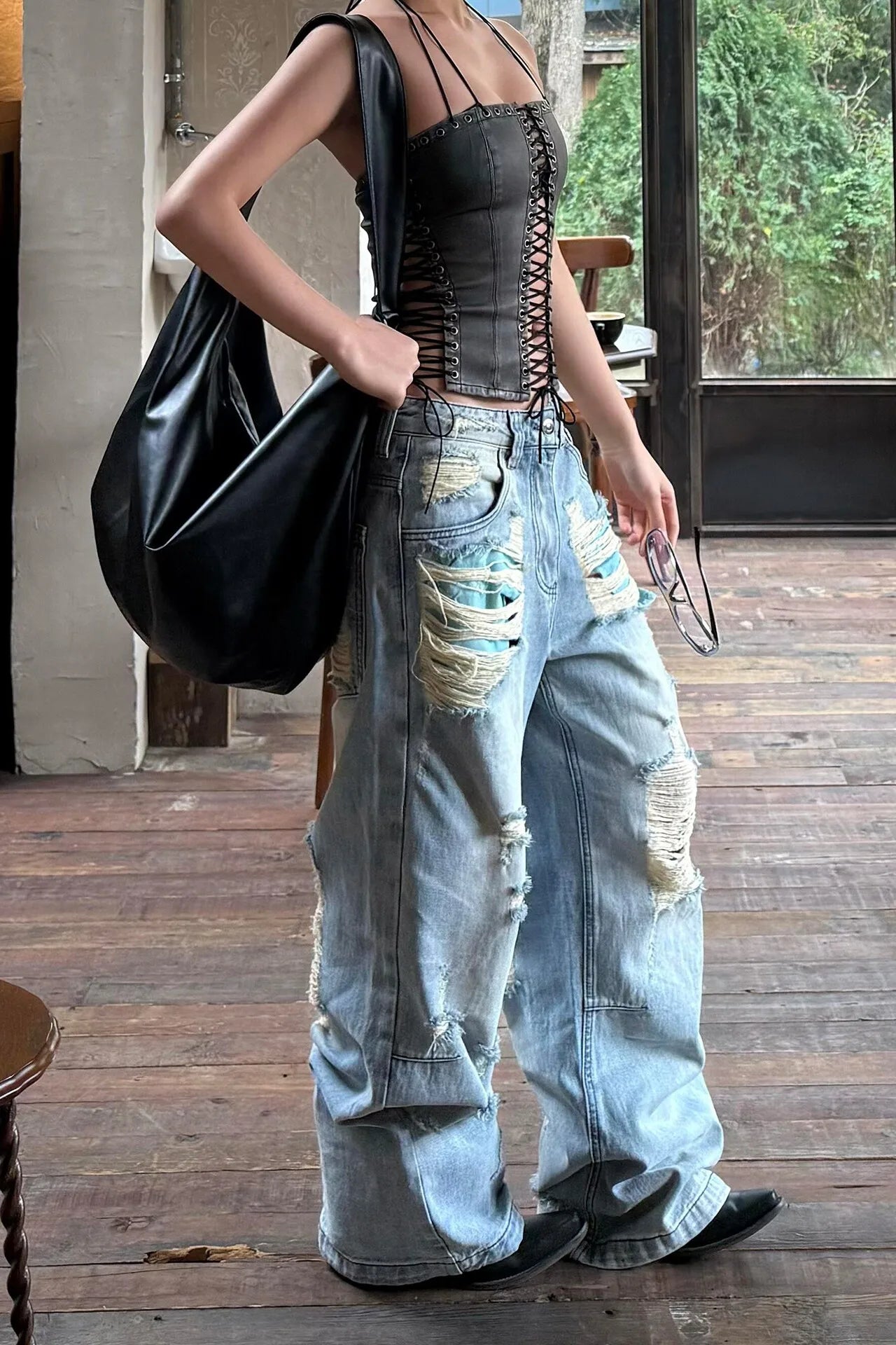 Relaxed fit denim jeans with a vintage washed finish and distressed details. Designed with a wide leg silhouette for a bold streetwear edge and all-day comfort.